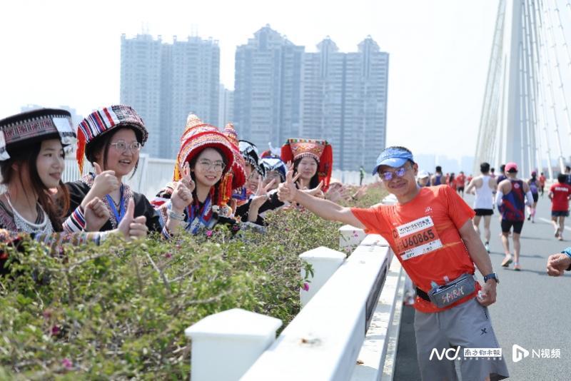 两座大桥上,身穿壮、瑶民族服饰的“清马宝贝”啦啦队与跑者们击掌助威。